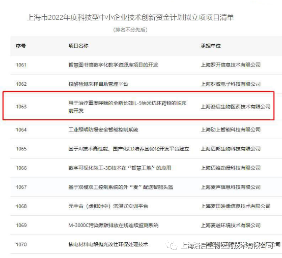 近期,上海市科学技术委员会组织的“上海市2022年度科技型中小企业技术创新资金计划”拟立项项目名单公示完毕,SG胜游(中国)生物“用于治疗重度哮喘的全新长效IL-5纳米抗体药物的临床前开发”项目入围。